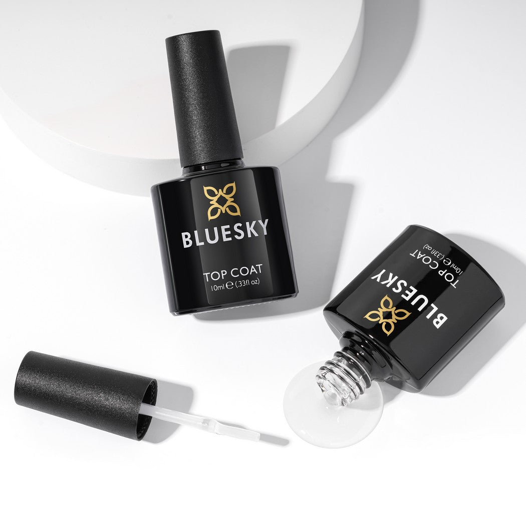 BLUESKY Top Coat protects your gel polish which allows your manicure to last for a longer time. A top coat forms a very hard and durable layer over your polish which prevents them from getting damaged and stained easily. It also acts to insulate your polish from excessive contact with water and other harsh chemicals that can cause your polish to peel and chip easily. It adds a nice glossy sheen to your manicure making your polish look more sleek and professional.
